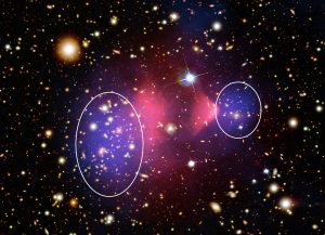 Pudo comprobarse que las zonas donde el efecto gravitacional es mayor corresponden a las rodeadas por óvalos, y por tanto es donde debe encontrarse la mayor parte de la materia, pese a tratarse las galaxias despojadas de sus nubes de gas. Por tanto, la mayor parte de la materia de los cúmulos no está en las nubes de gas, por lo que la ley de Newton sigue operando a esas enormes distancias y debe existir alguna materia que no vemos. Se han analizado varios choques de cúmulos y todos exhiben una separación entre las nubes de gas y la materia oscura. Lo que nos da pistas adicionales sobre su naturaleza, concretamente que la materia oscura no solo interacciona muy poco con la materia ordinaria, sino muy poco con ella misma. De lo contrario, las nubes de materia oscura también habrían friccionado entre sí y quedado rezagadas.