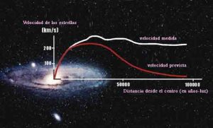 Al estudiar las estrellas de otras galaxias, se esperaba comprobar que cuanto más lejanas estuviesen del centro de su galaxia, más despacio deberían orbitar. Lo que se encontró fue que la velocidad de las estrellas parecía ser aproximadamente siempre la misma, aunque la distancia al centro fuera muy grande. La explicación más sencilla, aunque revolucionaria, es que además de la materia visible, existe otra invisible que se extiende mucho más allá de los límites visibles de la galaxia, de manera que la velocidad de la estrella no disminuye con la distancia.