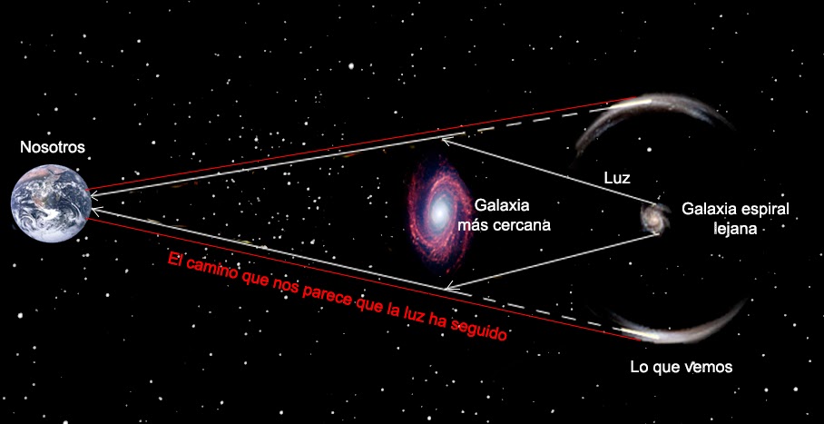 Estas observaciones están confirmadas en múltiples galaxias estudiadas, incluida la nuestra, la Vía Láctea. En general se puede afirmar que la masa visible de una galaxia constituye el 10% de la misma, siendo el 90% restante materia oscura. Una posible explicación, que no implicaría la existencia de ninguna materia invisible, sería que la ley de gravitación universal de Newton, que funciona estupendamente en el Sistema Solar, quizá dejase de ser válida cuando están implicadas masas y distancias mucho más mayores, como es el caso de las galaxias. ¿Podría ser que la constante de gravitación universal G, después de todo no fuese tan “universal”? Se ha comprobado que esto no es así, pero para entenderlo primero hay que explicar el fenómeno astronómico de las “Lentes Gravitacionales”. Esta predicción extraordinaria de la relatividad general de Einstein pudo ser confirmada experimentalmente durante un eclipse total de Sol en 1919, lo que supuso un respaldo decisivo para la teoría y que Einstein se convirtiera en una celebridad mundial.