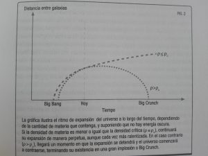 Ahora podríamos preguntarnos ¿en el futuro, el universo continuará expandiéndose al mismo ritmo? Pues bien, la teoría predice que para un universo lleno de radiación y materia (lo misma da que sea ordinaria que oscura), el ritmo de expansión debe ralentizarse. De hecho, si la cantidad de materia fuera suficiente, la atracción gravitatoria sería tan grande que llegaría un momento en que el proceso se invertiría, y las galaxias retrocederían sobre sí mismas. Es lo que se conoce como “Big Crunch”, o Gran Implosión. Todo depende de que la densidad del universo sea menor o mayor a una densidad crítica ρc.